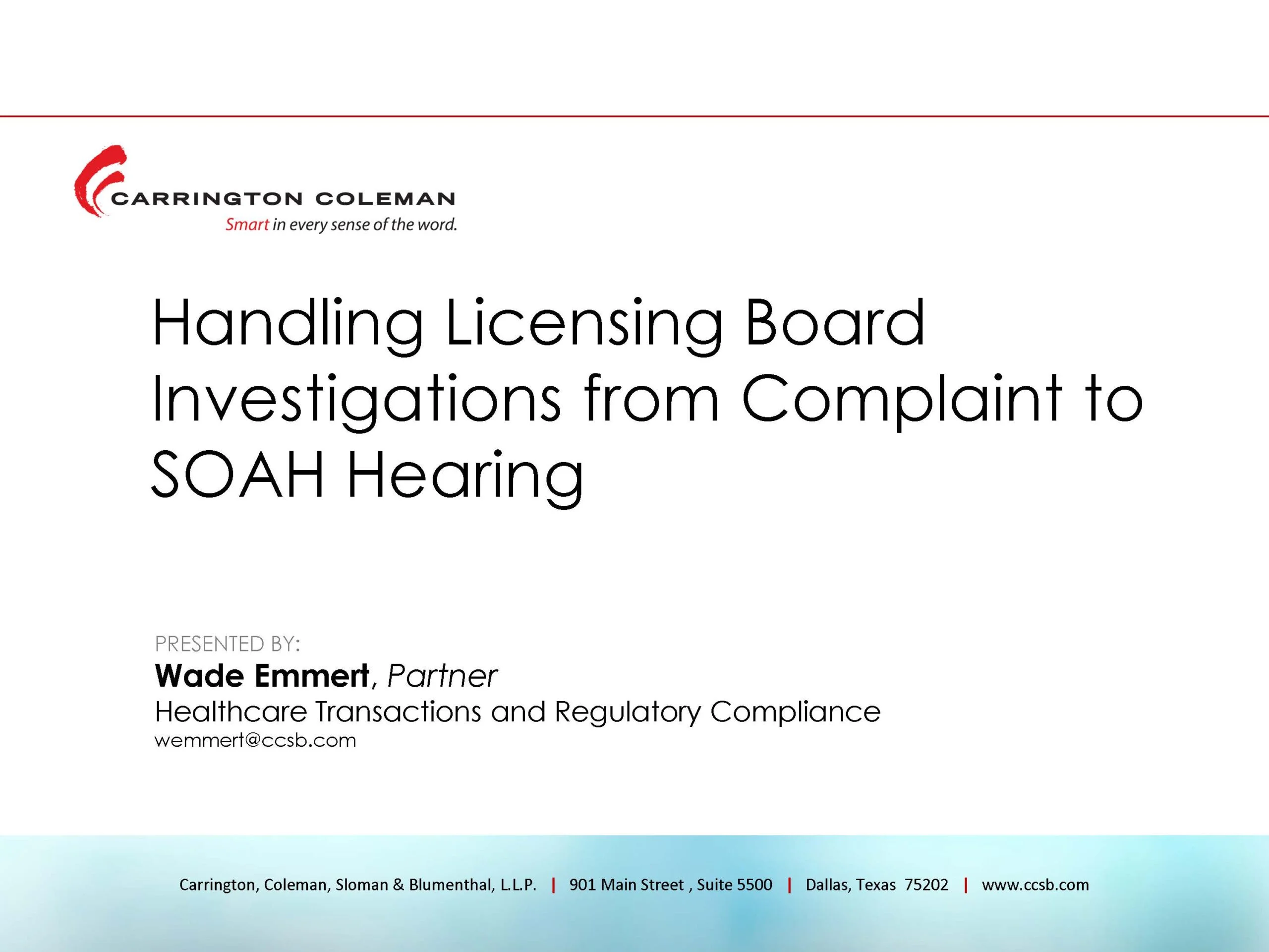 Licensing board complaints and investigations usually follow two general phases. There’s the informal phase from the filing of the complaint to the informal settlement conference and agreed order. If a licensee chooses not to accept the board’s resolution, the practitioner can request a more formal hearing before the State Office of Administrative Hearings (SOAH).